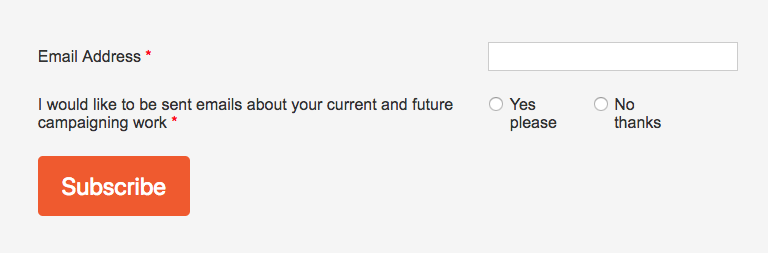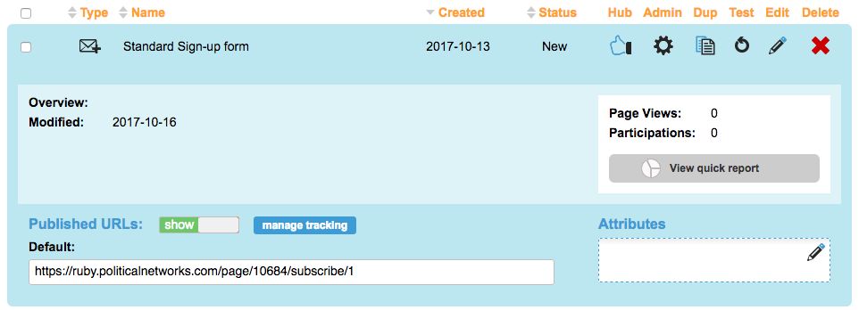 A Sign-up form is a type of page that falls into a category you might call ‘List management’. It allows you to create a page that is separate from your campaign actions, and supporters who enter your database (sign-up) through such a page can be easily identified.