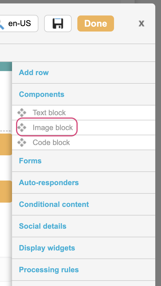 To create a new image block, drag in an image block from the toolbar components.