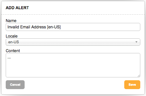 Locate the alert you need and click the “create new” button or duplicate an existing alert by clicking the duplicate icon. A window will open that allows you to edit the name, locale, and content of your alert.