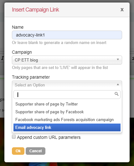 When adding a campaign link to an email, any parameters you have applied to your page will show.