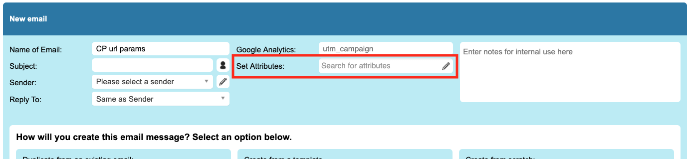 In the same way, you can click into the box to display the available attributes and click each one you want to assign. Click the pencil icon to create a new attribute. Attributes added to email campaigns will appear on the supporter record when the support opens an email.