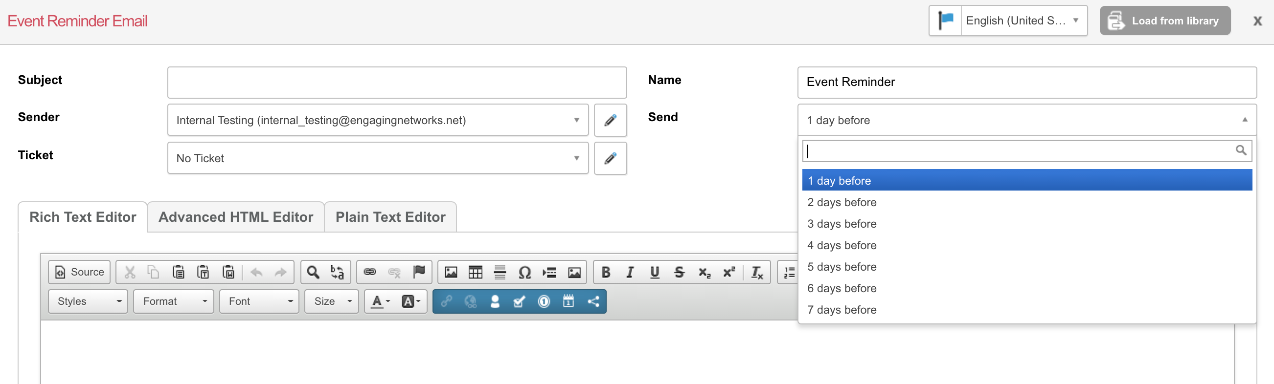 The send time of the reminder email auto-schedules according to the start time of the event at the time the supporter submits the page (i.e. a reminder email sent 1 day before an event scheduled to start at 6pm ET will send at 6pm ET the day prior).