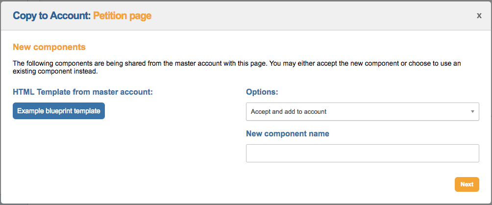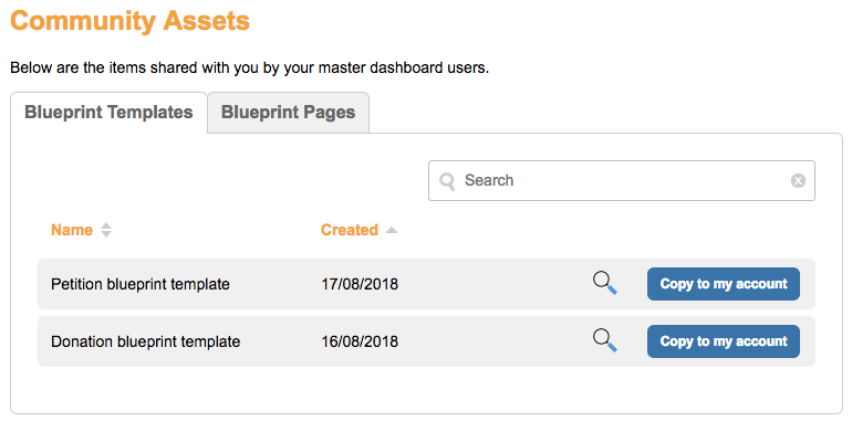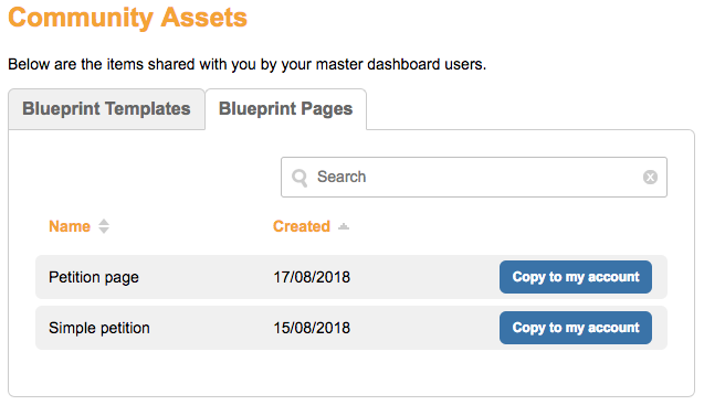 From the Master Dashboard you can build a page blueprint of petition or donation pages. This will allow the master user to copy over a skeleton page, complete with text, code, image and form blocks to the community assets of shared accounts, so sub-account users will not have to construct shared pages from scratch.
