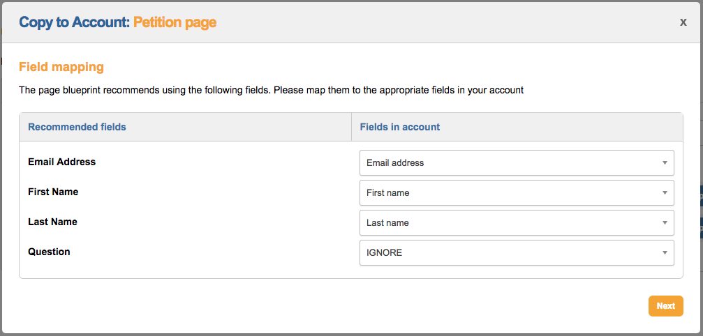 Click Next, and it will ask you to map the page’s form block’s fields to your own account data structure: