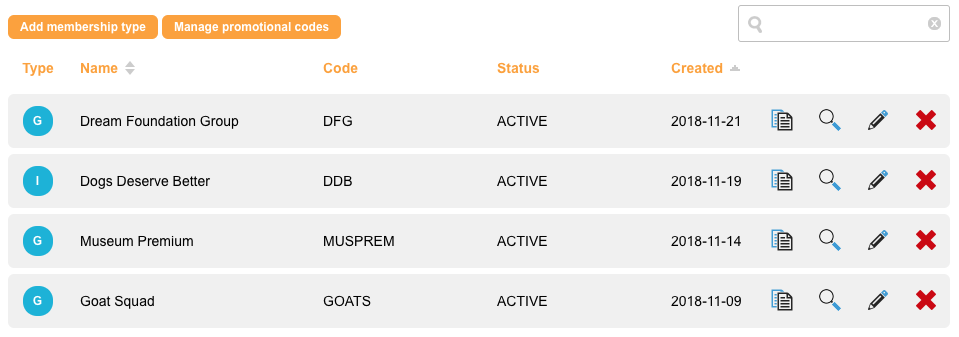 The list gives a summary of the membership types that exist, along with the standard duplicate, view, edit and delete buttons.