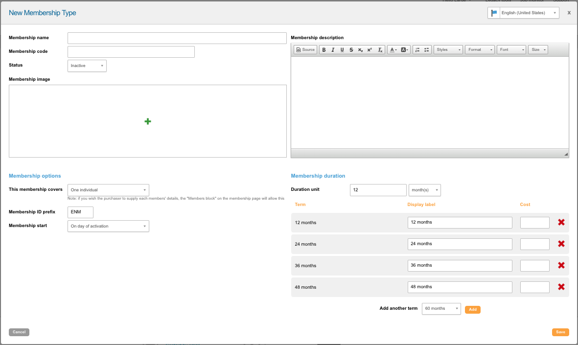 This area allows you to specify variants of the membership’s duration. The first input allows you to specify the duration in months or years. You can then have a series of products that use these duration units and have a price set against them, which might be set to encourage the supporter to buy a longer term.