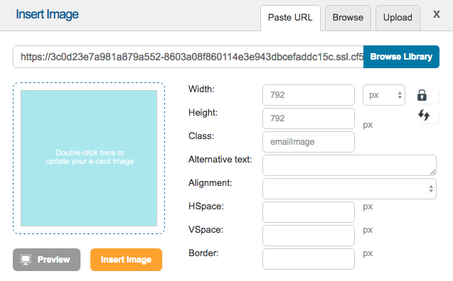 You can use this tool to select an image from Engaging Networks library, upload an image from your computer, or paste in an image URL. After you have chosen your image, just click Insert Image to place it into the email body.