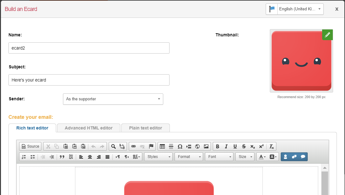 Subject – this is the subject of the email sent to the supporter that wishes to send the Ecard