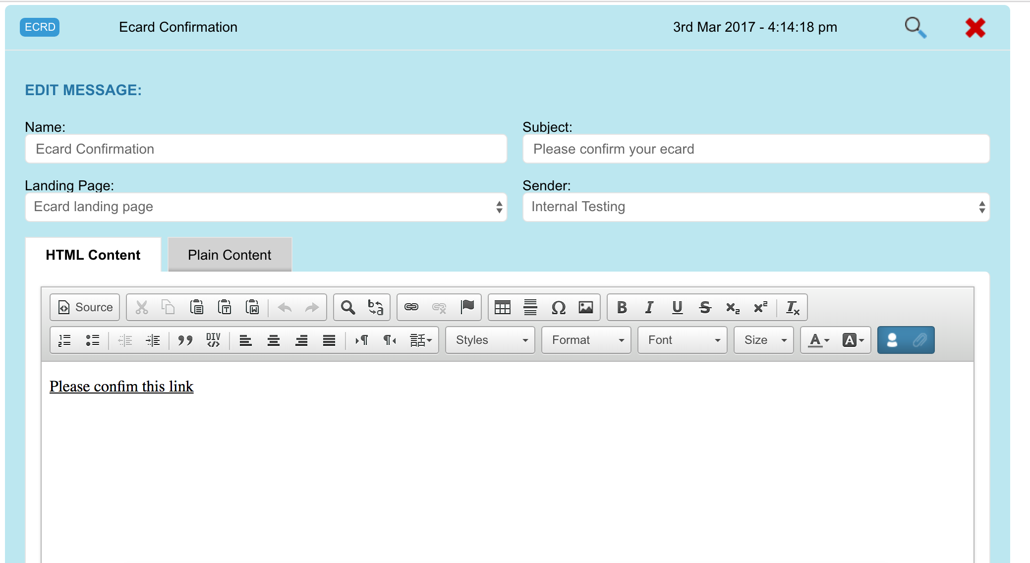Don’t forget to create the confirm link by highlighting the phrase and clicking on the blue paper clip. Without this link, you will not able to send the Ecard. Also – consider letting the supporter know that the confirmation link expires after 1 hour.