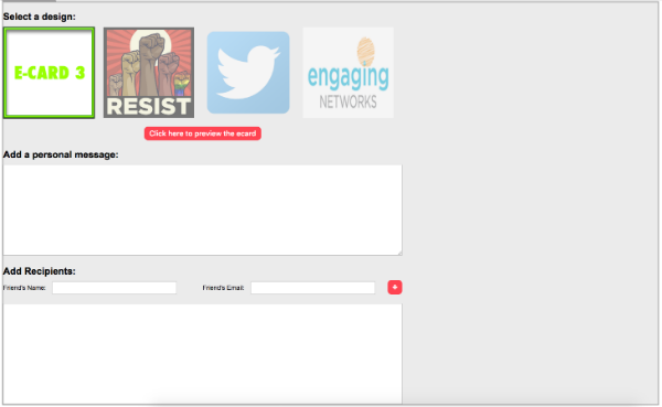 Ecard pages are unique in that they have an “Ecard block”. These consist of a display of available email designs, a space for their personal message, and allows the supporter to add their friends’ email addresses for delivery. You also set up the confirmation message here.