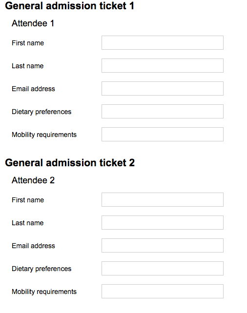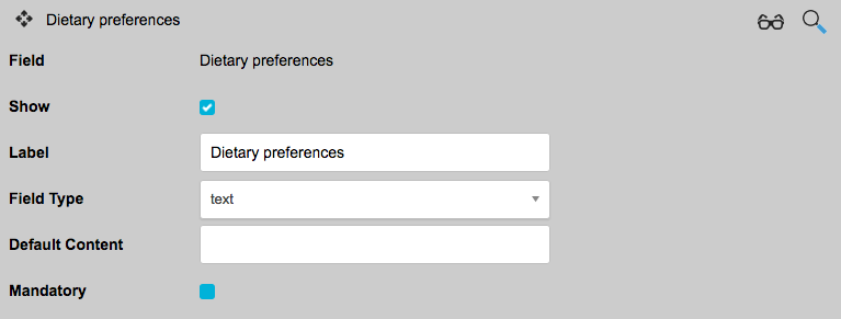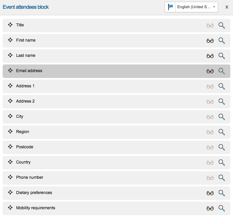 By default, First Name, Last Name, Email Address, Dietary Preference, and Mobility Requirements are added to the form. If you would like to disable or enable other fields you can hover on the attendee block and click the “settings” option. This will open a lightbox that allows you to customize each of the attendee fields.