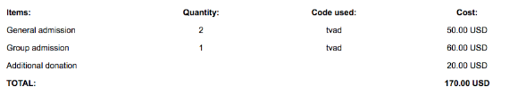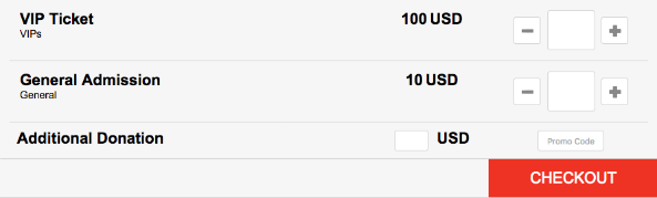 The ticket component allows your supporters to specify the number and type of ticket they wish to purchase. It also allows them to enter a promo code if you are offering discounts. The ticket component content is automatically populated based on the ticket settings you specified when you created your event.