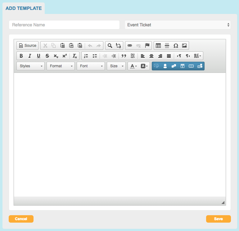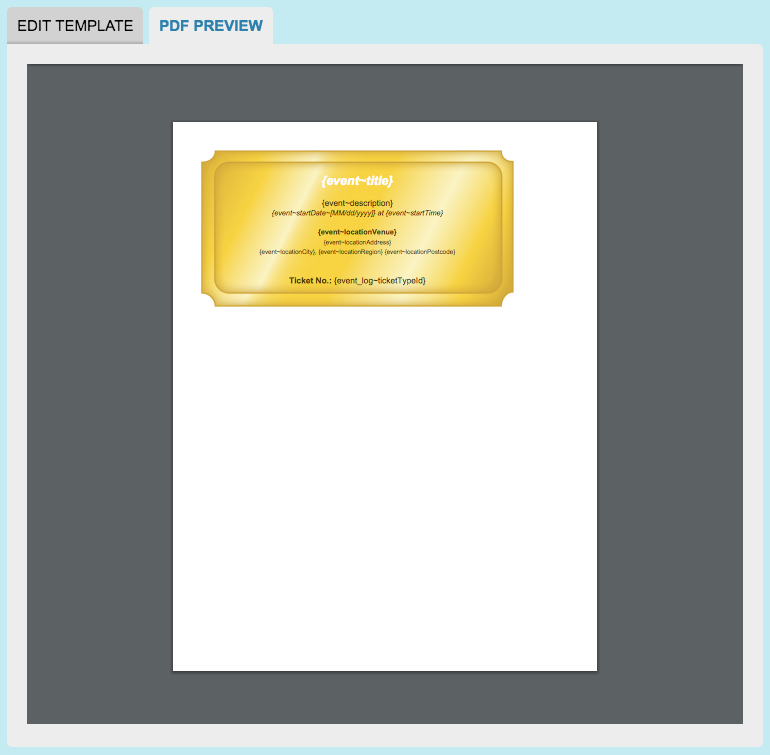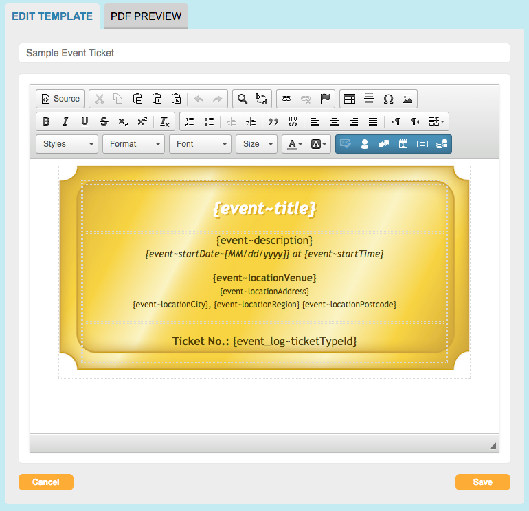 The ticket templates are based on HTML and use a rich text or WYSIWYG editor to create the PDF the same way all other emails are created in Engaging Networks.