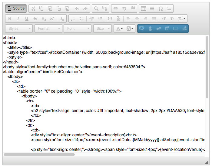 The editor also allows you to access the source code directly, making it possible to build the ticket using an external HTML editor and then to paste your source code in.
