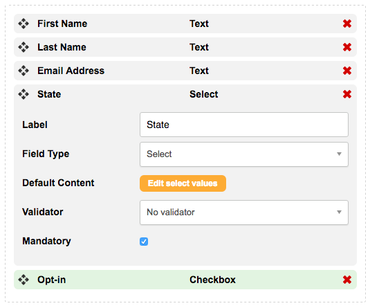 Select – a select (aka a dropdown) when clicked will display a choice of values. These are useful for inputs that can have a lot of set values, for example Title or Country. The Default Content is important – you have two types of content, a Label (displayed to the supporter) and a Value (that is actually saved and validated against). For example you might have a label of “United States”, but a value of “US”