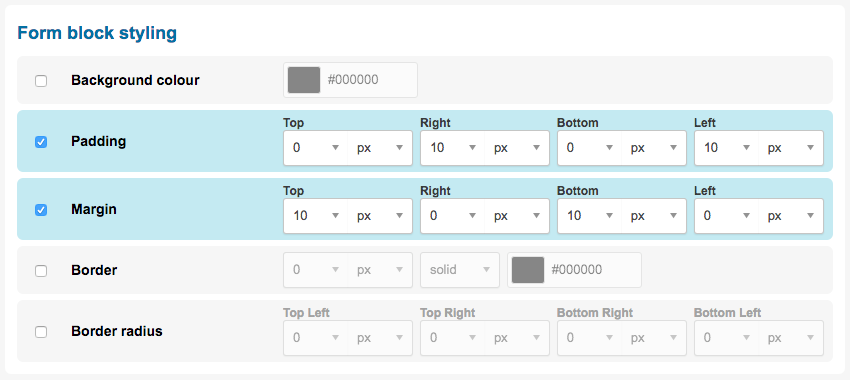 Border radius | Use this to add rounded corners to your form block. These are measured in pixels, ems, rems, points, or as a percentage. You can also set top, right, bottom, and left sides independently. |