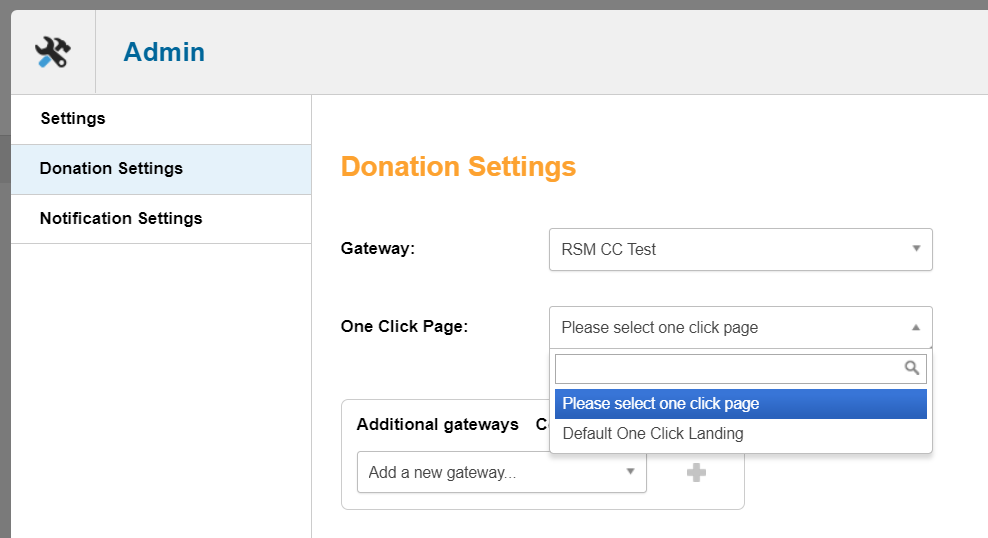 Click the Donation Settings tab and select the One-Click Donation page you would like to use from the dropdown menu and save your changes
