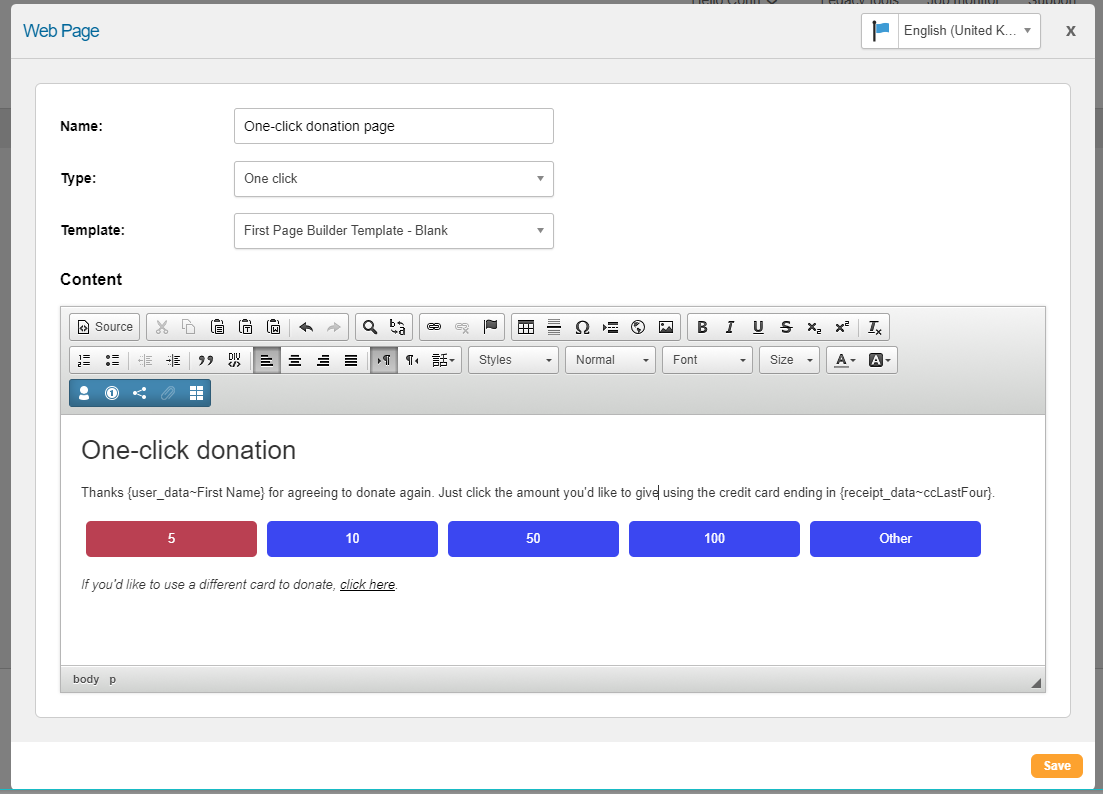 Add the content of your web page that you want the supporter to see when they land on the page, including the donation amounts they can select. There are several insertion tools for this: