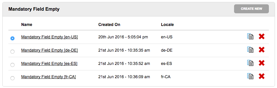 Locate the alert you need and click the “create new” button or duplicate an existing alert by clicking the duplicate icon. A window will open that allows you to edit the name, locale, and content of your alert.
