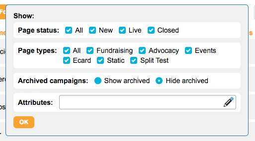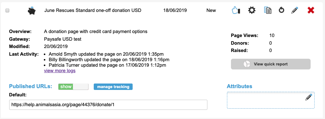 From here you are able to create new pages and move pages into folders. Each page in the list has additional options where you can preview your pages, amend them, access your URLs, manage tracking, view quick reports and download messages your supporters sent. You can also manage the status of your pages here.