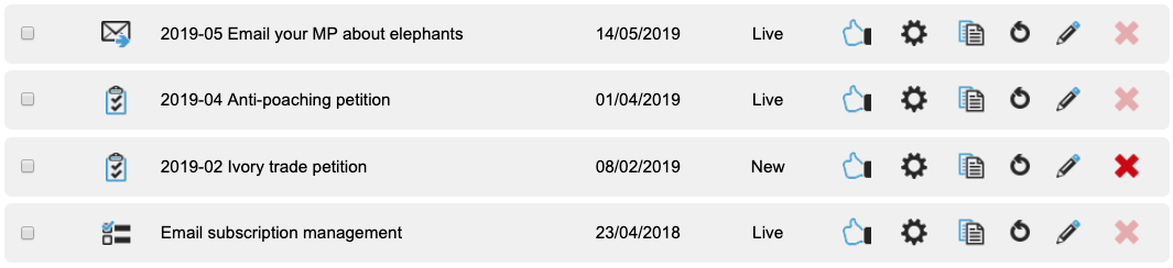 The page list displays all your pages with the most recently created at the top. The Type column uses icons to describe the type of page it is (e.g. Donation page, petition). The Name is the name you set in the page settings. You can order by any of these columns.