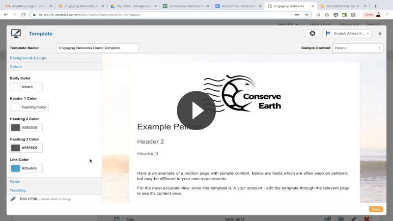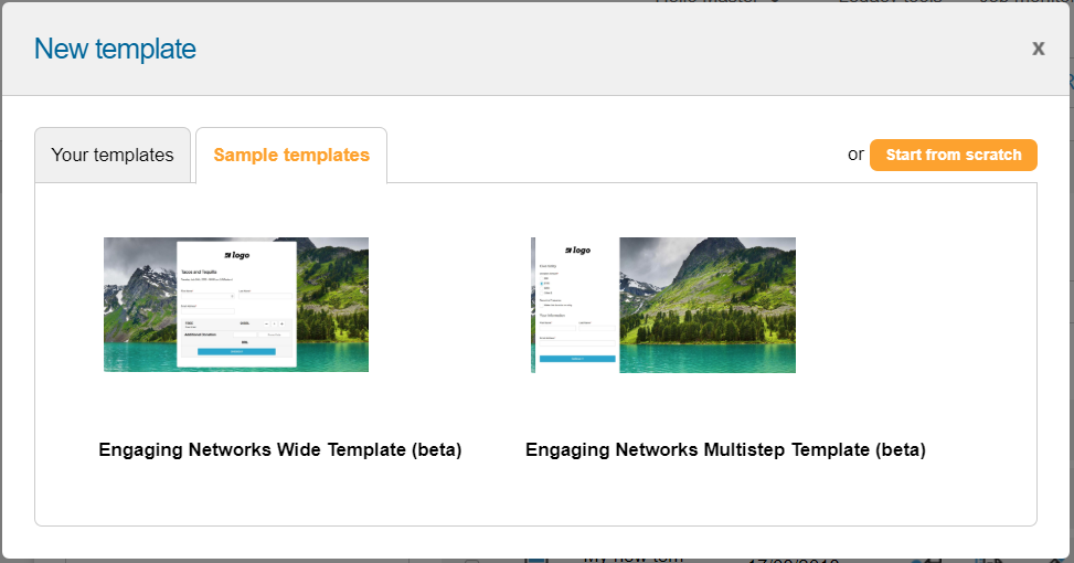 There are a couple of sample blueprint templates available, which you modify. This is useful if you do not have the capacity to create a template from scratch, or if you would prefer a different look and feel for your Engaging Networks pages.