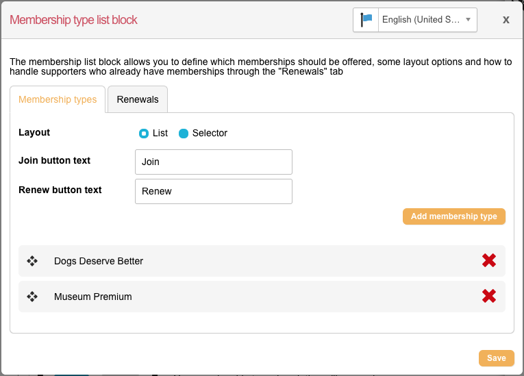 The first tab is used to decide what membership types should be offered, taken from the Membership types created in Components. You can add, remove, and re-order them using the arrow icons. You can also set the Join and Renew button texts should you wish.