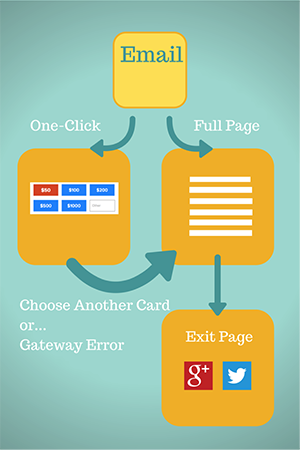 The other option from the one-click page is for the donor to complete the transaction, charging the same card. They will only need to select a donation amount, or simply submit the default selection in the donation amount field. Submitting the one-click page will tell our software to take the stored token and the donation amount, and submit them to the payment gateway. If the response from the gateway is to approve the transaction, we will display the normal exit page. If the gateway rejects the transaction, we will display the normal donation page so that the donor can enter new card data and update address information and re-submit. This flow is illustrated in Figure 2.