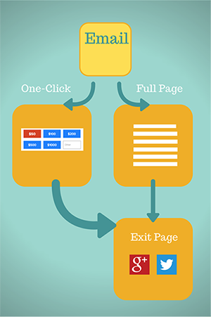 What happens if someone clicks on a link in an email for a One Click page subsequent times after the first click? One Click page links in emails should only work the first time they are clicked. If it is clicked a subsequent time, the donor will be taken to the original donation page the One Click page is attached to.