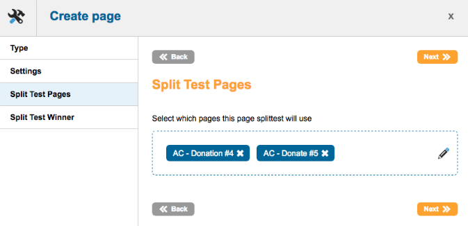 Click the pencil icon to view a list of all of your page-builder pages. Tick the box next to the pages you wish to split test and click “Use selected”. You will now see the pages you chosen and can click Next to proceed.