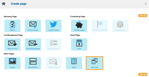 A ‘split test’ action enables testing of two or more pages (advocacy or fundraising) and is used when you want to see which page design or layout performs better. The page-builder tools automatically ’round-robins’ your supporters to one of the pages until you (or the system) determine the ‘winner’.