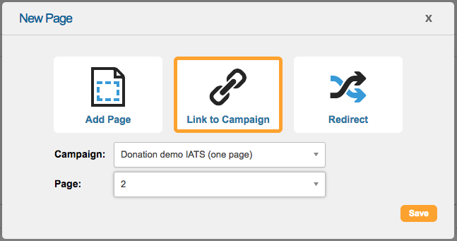 To do this, simply add a new page to your campaign and choose “Link to campaign” for an Engaging Networks page (which will also pre-populate any information already collected), or “Redirect” for a page outside of the system (e.g. your website).