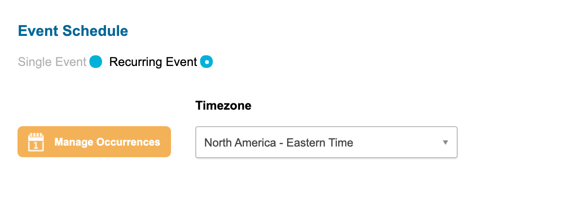 In the Event Details settings, select Recurring Event instead of Single for multiple occurrences. Click Manage Occurrences to schedule the recurring event instances.