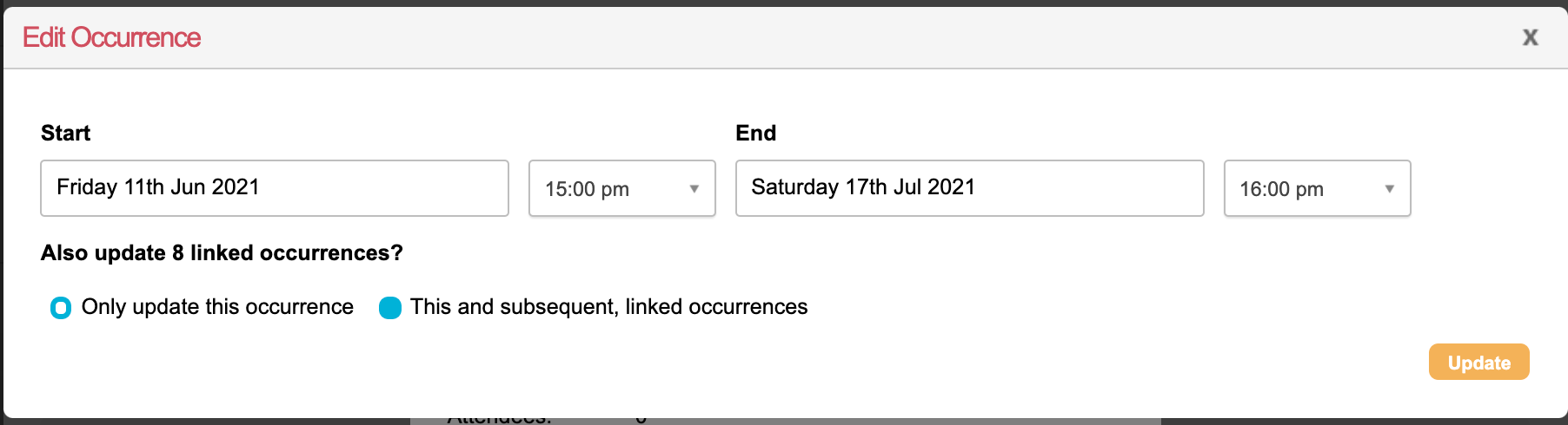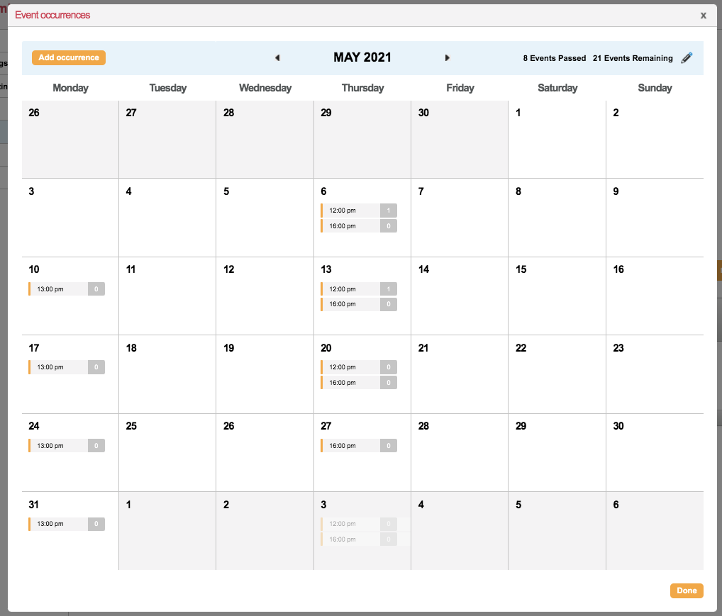 Use the calendar search to view and modify individual occurrences and view reporting.