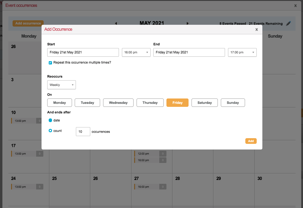 - specify if the event reoccurs weekly or monthly and the day of the week to reoccur