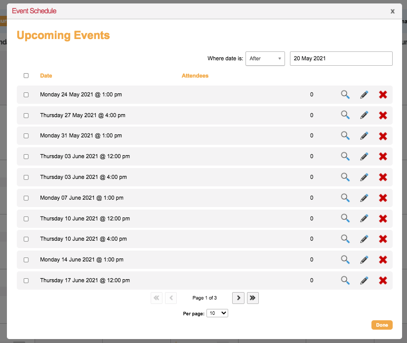 Event occurrences that have already taken place will not be able to be modified but will display options to view a Quick Report or Attendee Report from the calendar view.