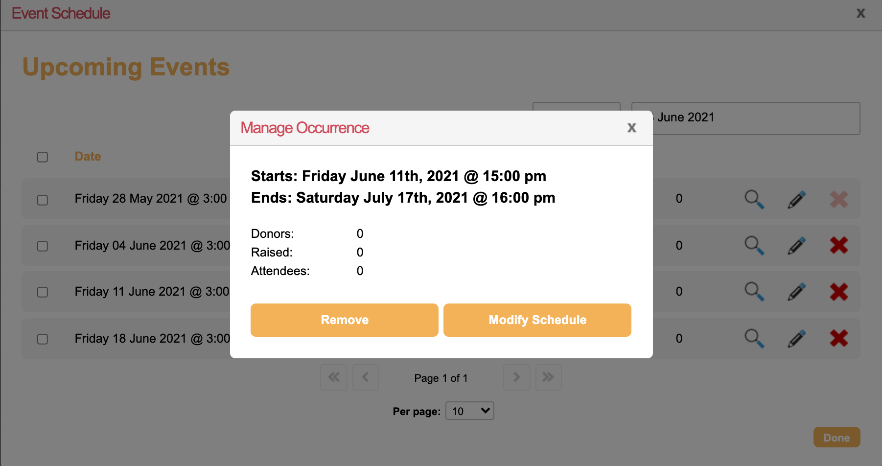 You may then use the magnifying glass icon again to view the instance to Remove or Modify the individual occurrence schedule and view a snapshot of reporting metrics for that occurrence.