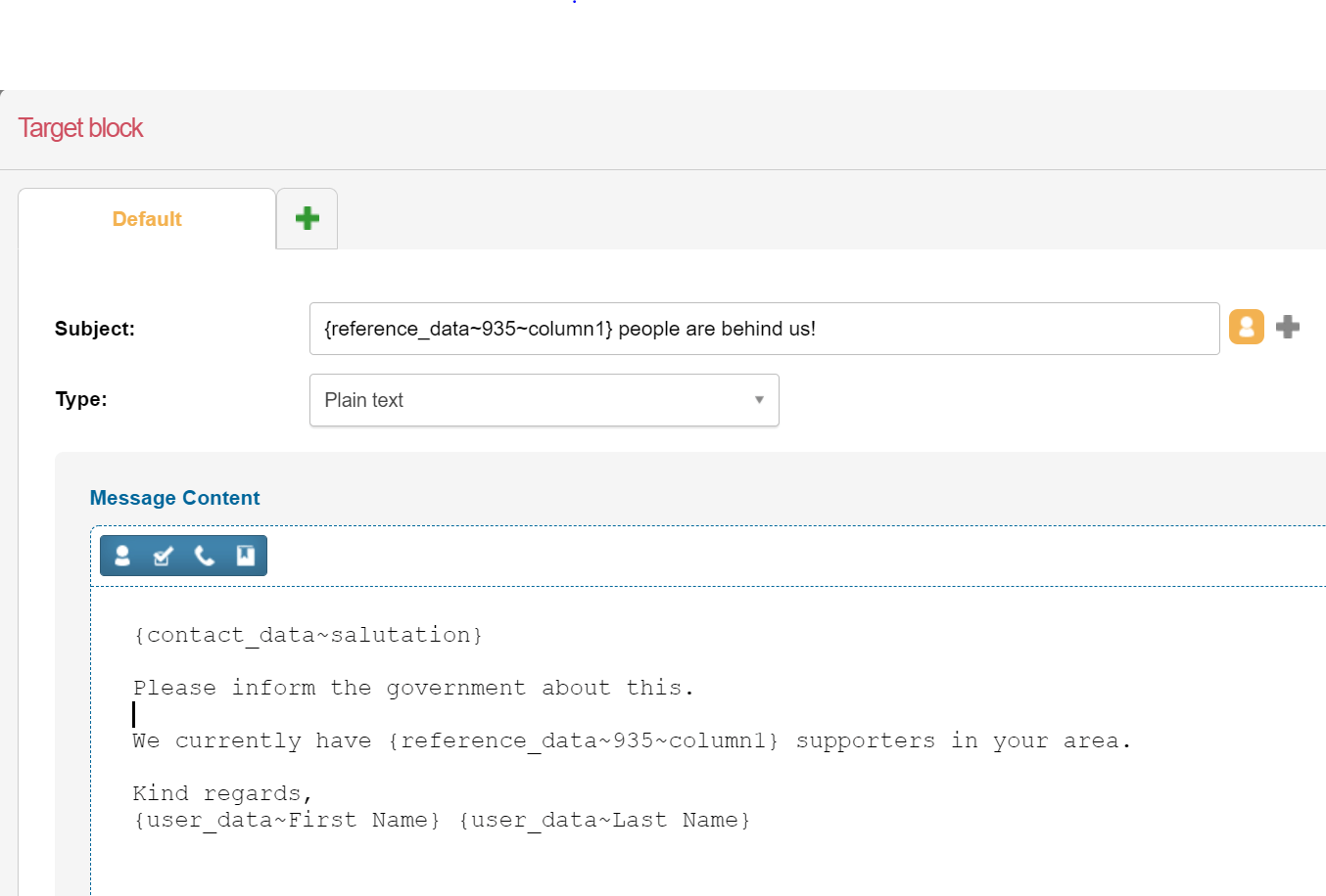 The Reference data functionality allows your supporters to send messages that includes target-specific data (text and statistics) to politicians and other decision-makers. This can be added to Email to Target, X to target and Click to Call page types.