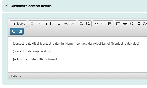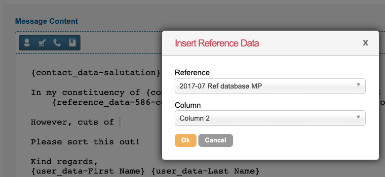 Click OK to insert the data, and a placeholder (displayed as text starting with reference_data, inside curly brackets) will appear, which will be “mail-merged” for the supporter when taking part.