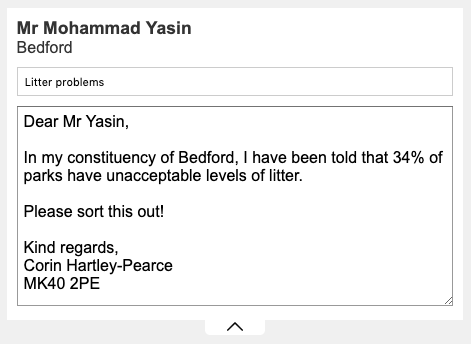 In the example above, “34%” has been dynamically inserted by using reference data for that constituency.