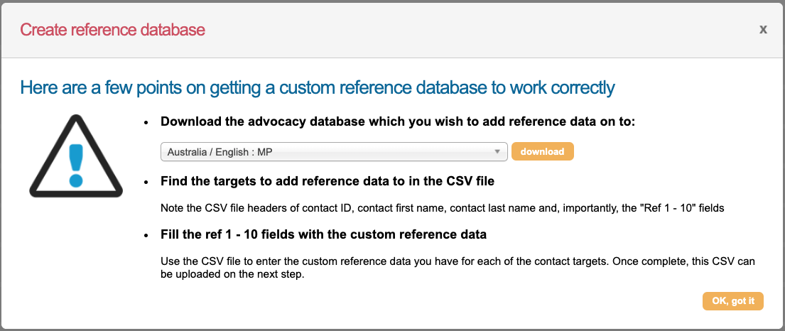 Choose the database you want to add reference data for. For example, “UK / English : Westminster MP”. This should be the database that you are using as your target database for the campaign, and click “download”