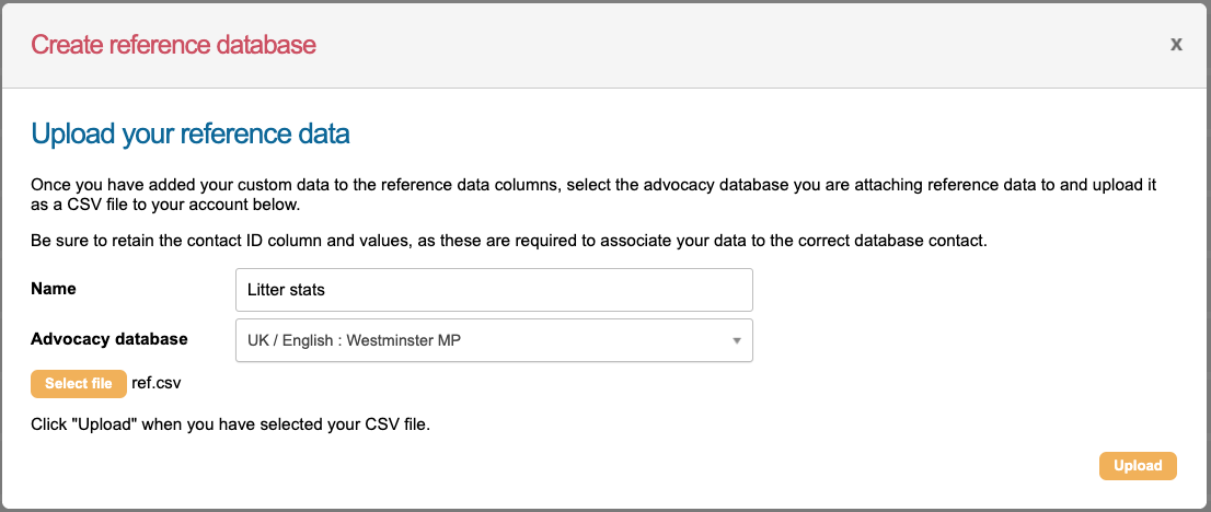 Save the spreadsheet and then, back in the software, click “OK, got it”. On the next screen, give your database a name, ensure it is the right Advocacy database and upload the file via “Select file”. Click “Upload” once done