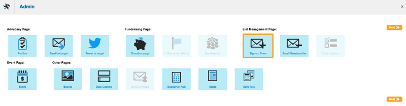 A Sign-up form is a type of page that falls into a category you might call ‘List management’. It allows you to create a page that is separate from your campaign actions, and supporters who enter your database (sign-up) through such a page can be easily identified.