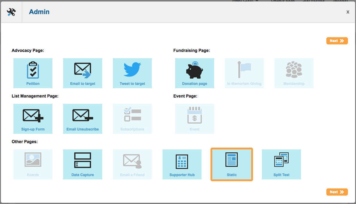 Static pages are a page-builder page type that allow you to create pages without any dynamic form functionality. They do not record any supporter interactions but instead are used as informational pages.