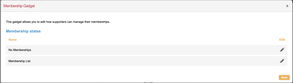 This gadget has two “states” under Membership states as seen when editing the gadget. When a supporter logs into the supporter Hub, the platform will determine their state based on previous membership history in the account and different content can be displayed to the supporter based on that state. For the membership gadget there are two states – No Memberships and Memberships List.