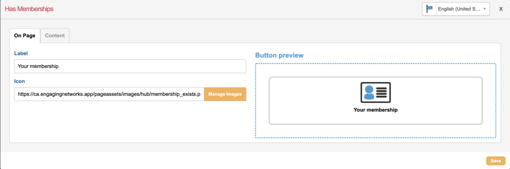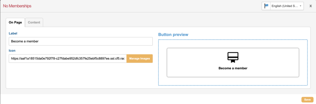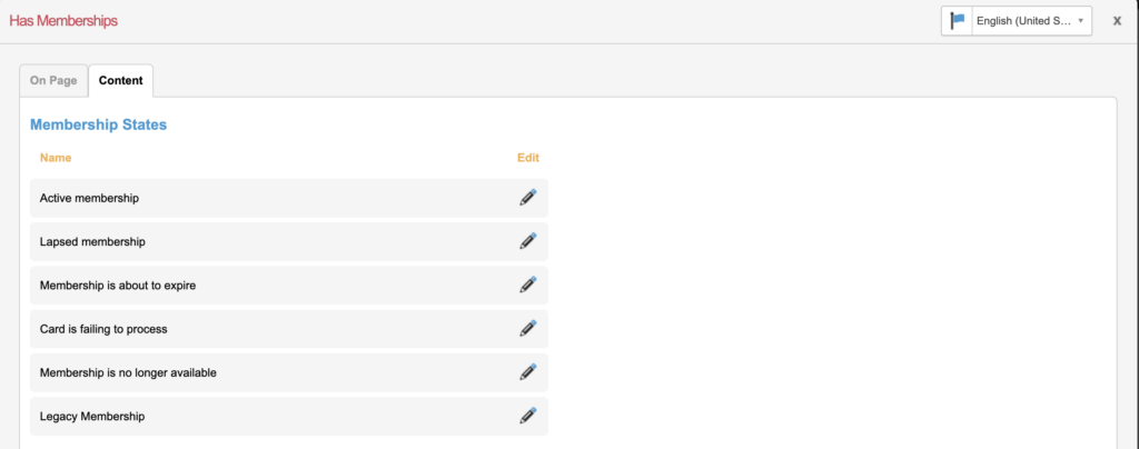 Additionally the labels and buttons and associated Membership page linked as a button displayed for all States can be edited from the Content tab.