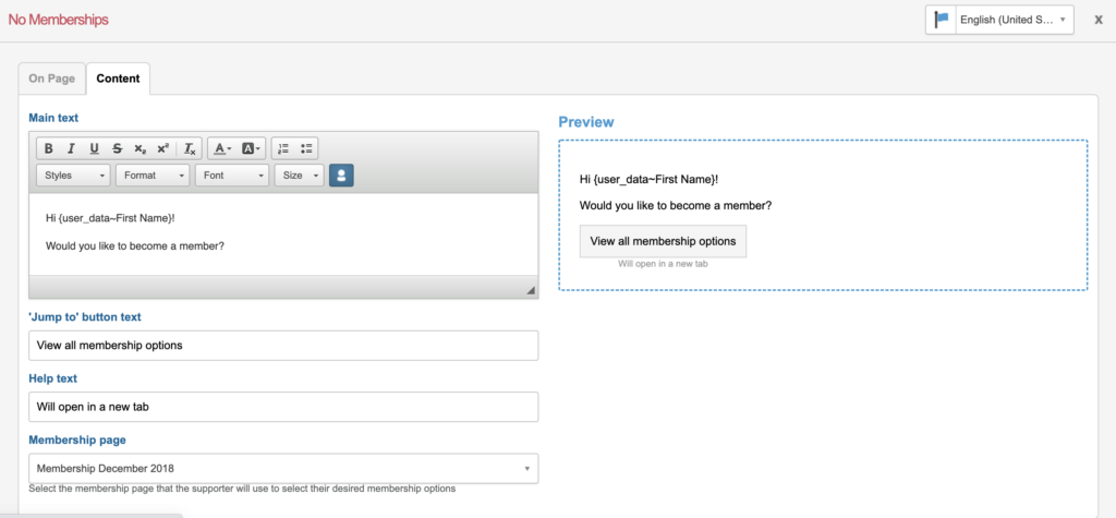 The content displayed to the supporter once they click the gadget can be changed under the Content tab. This tab includes an option to select a membership page that will be linked as a button where the supporter can sign up to be a member.