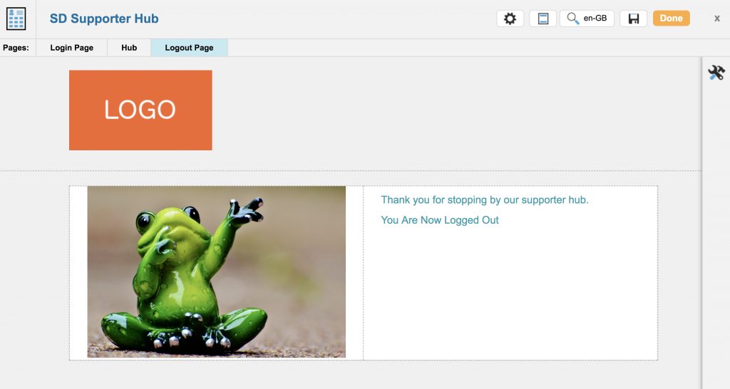When your supporter clicks the Logout link on your hub page they will be taken to the Logout page. This is a static page that you can style using standard page builder blocks. In this example we’ve added image and text blocks to the Logout page.