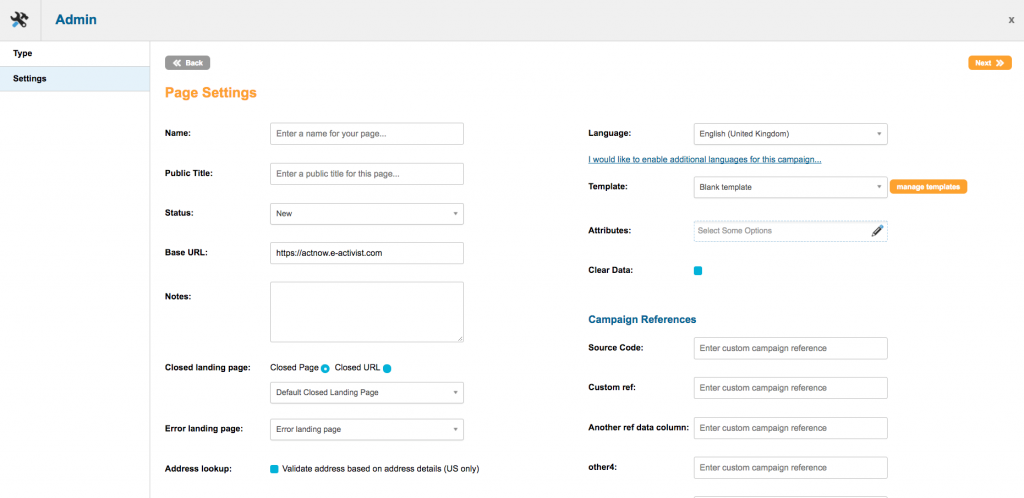 Name: Internal name for your page. This is for identifying the page within your Engaging Networks account