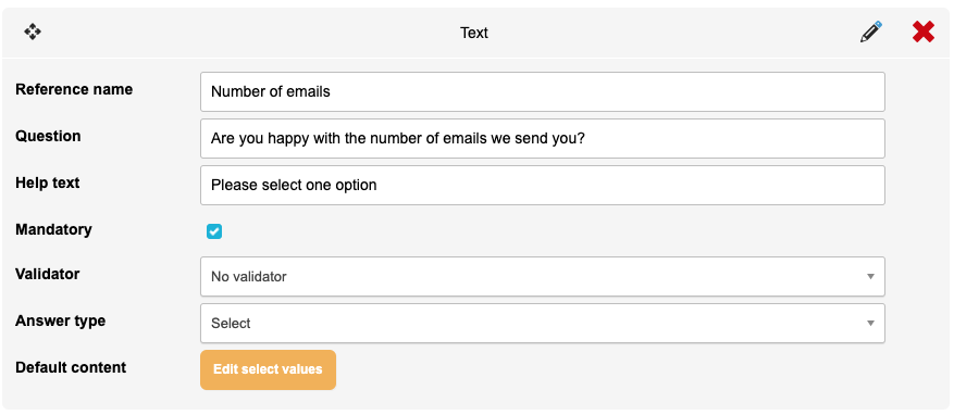 Default value / Default content – for a text answer, you can have a default value. For selects and radios, you will have default content to populate the various options the supporter can choose